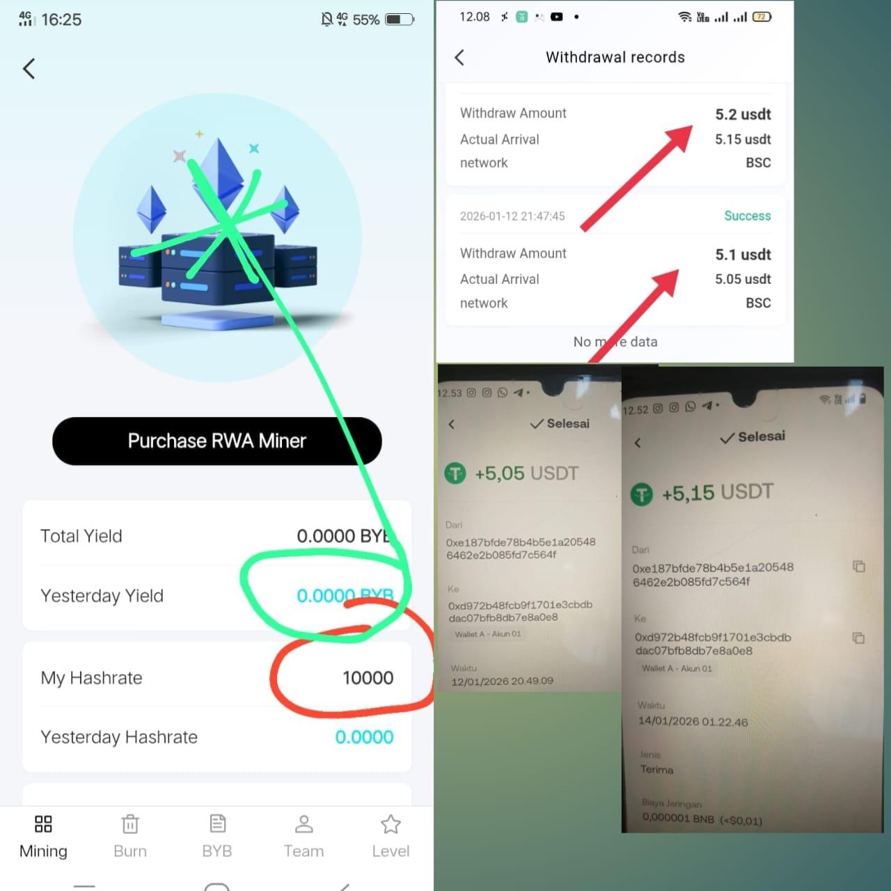 3. Untuk meningkatkan hasil harian bisa dengan undang teman, burn coin BYB untuk dijadikan Hashrate, dan deposit untuk beli hashrate.